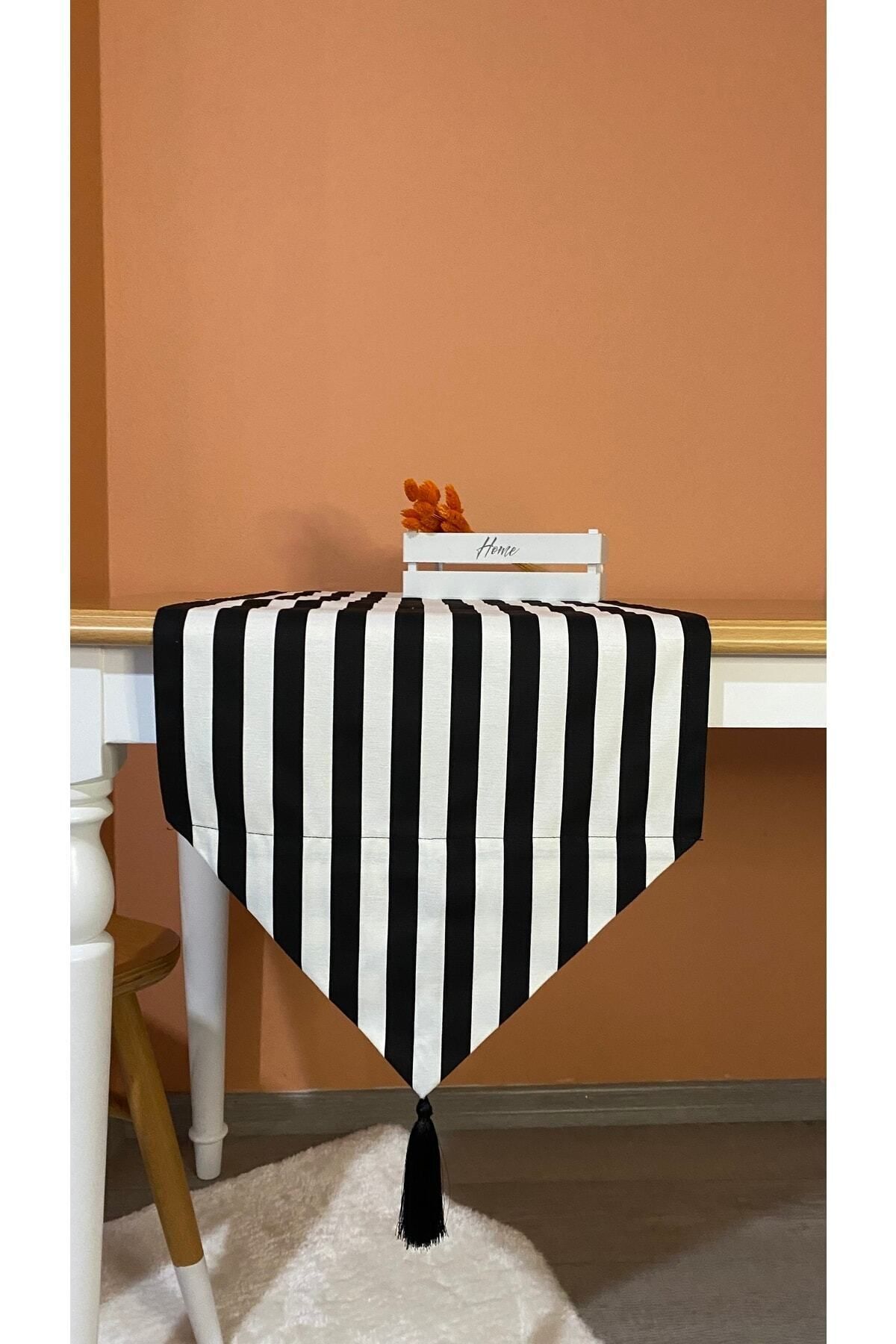 Geometrik Çizgiler: Çizgili Siyah Püsküllü Runner , Masa Örtüsü