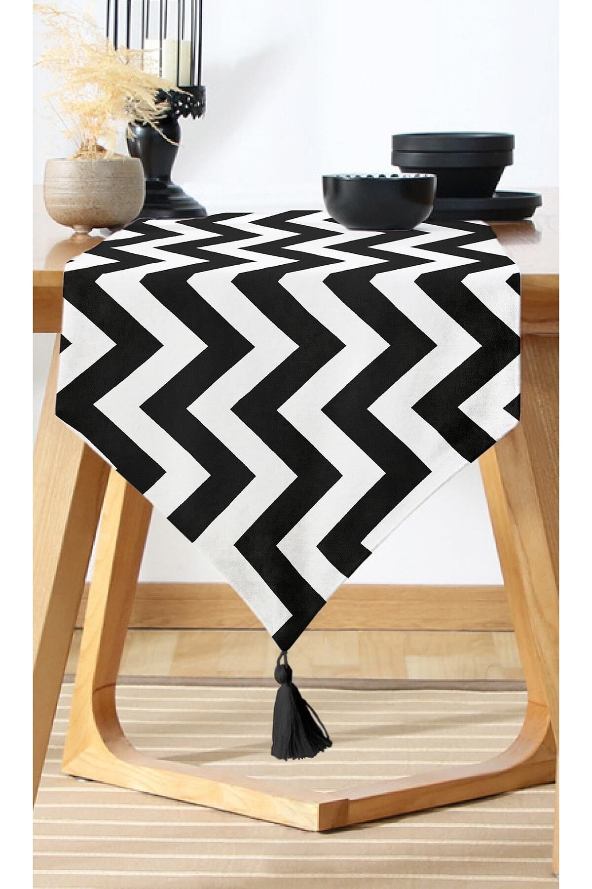 Geometrik Çizgiler: Zikzak Desenli Siyah Püsküllü Runner , Masa Örtüsü