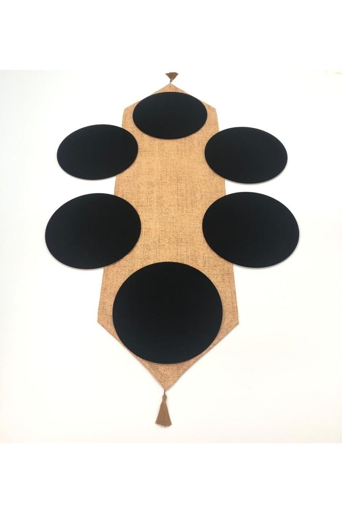 Naturale Şıklık: Üçgen Püsküllü Jüt Runner ve 6 Adet Siyah Supla Seti